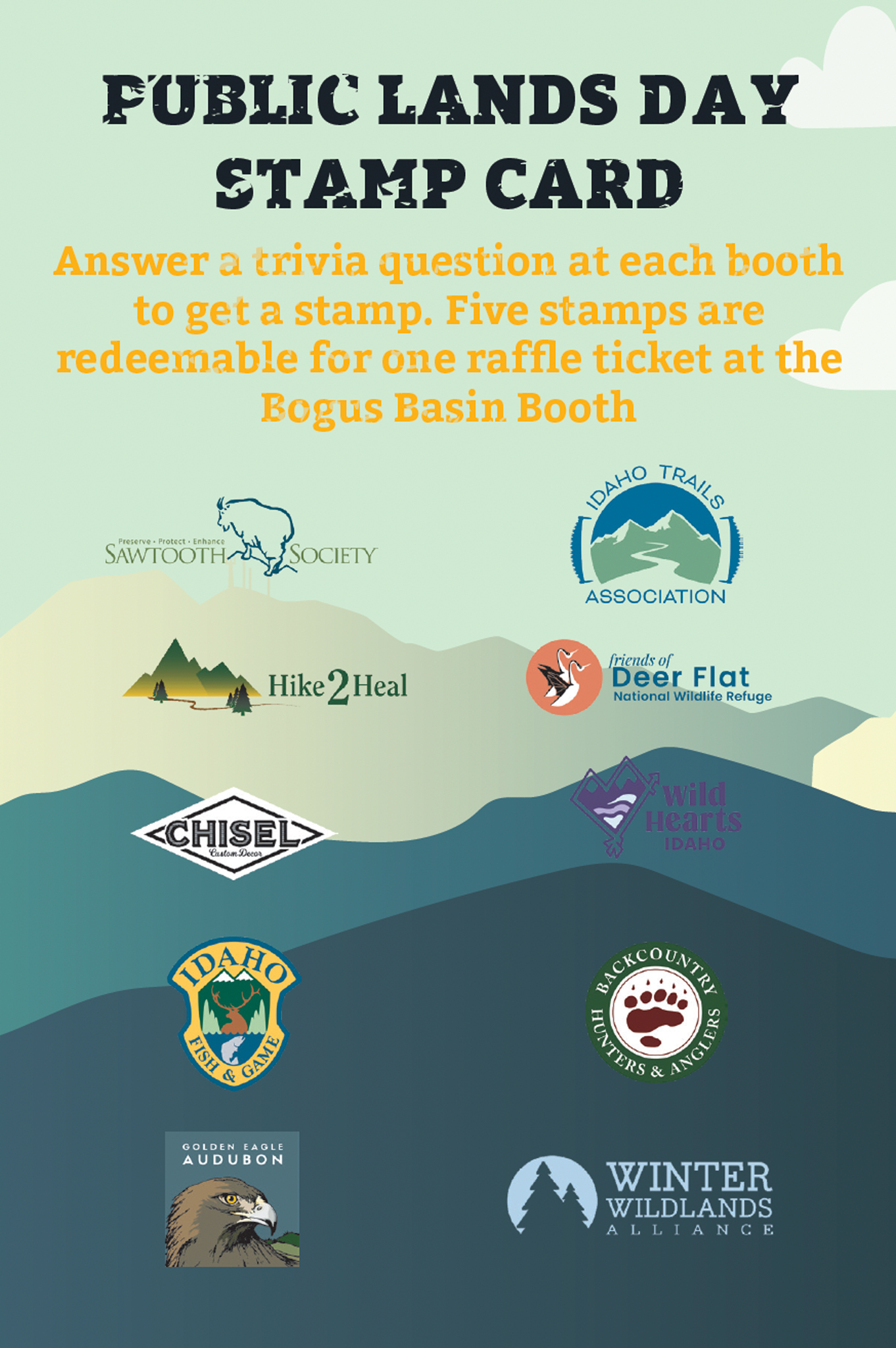 Guests collected raffle tickets by engaging with activities throughout the event. Visiting vendor booths and collecting five stamps earned one raffle ticket. Attending the Public Lands 101 Panel rewarded participants with five raffle tickets, while answering public land–themed trivia questions at the Environmental Education booth earned one ticket per correct answer.