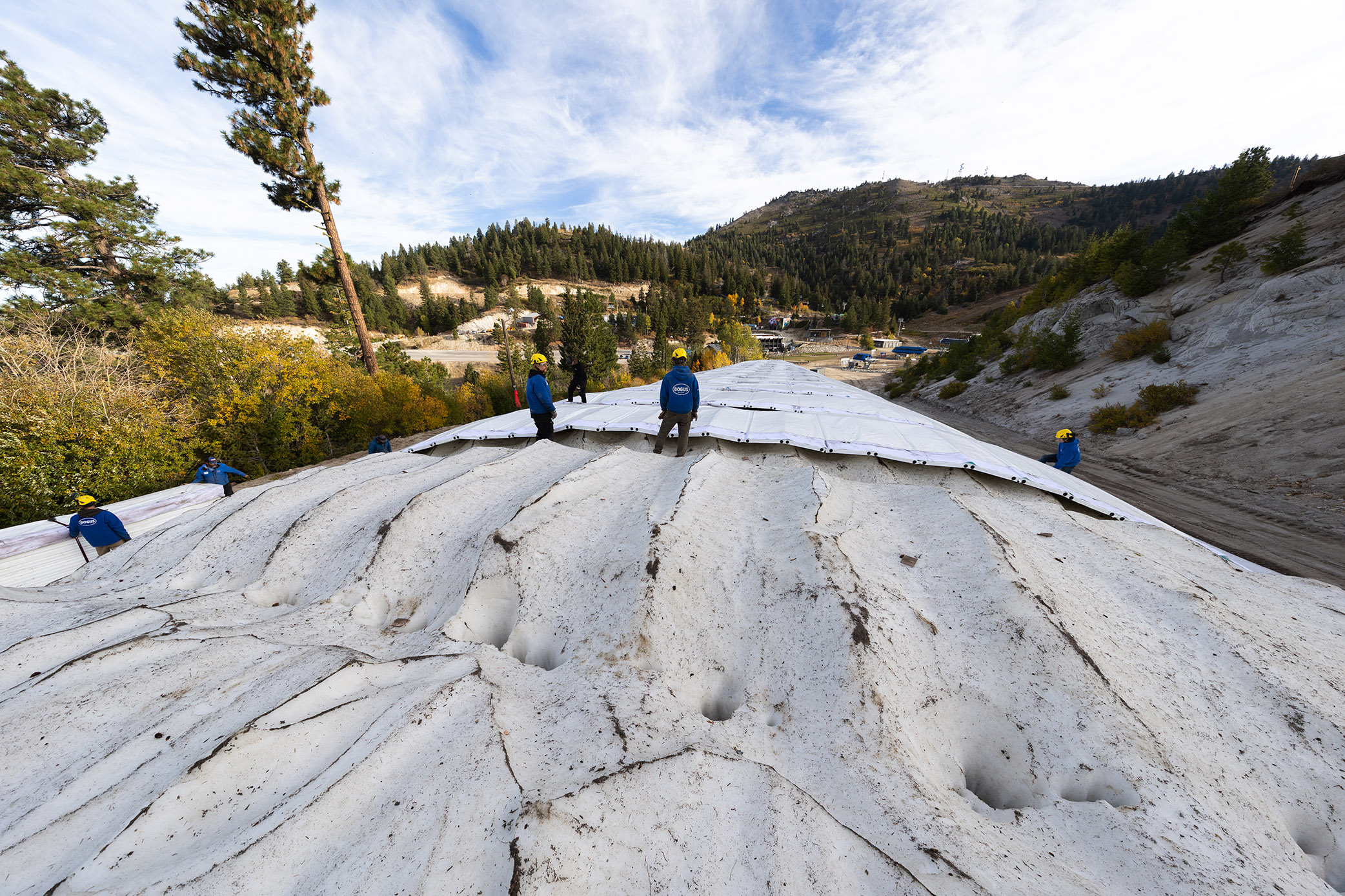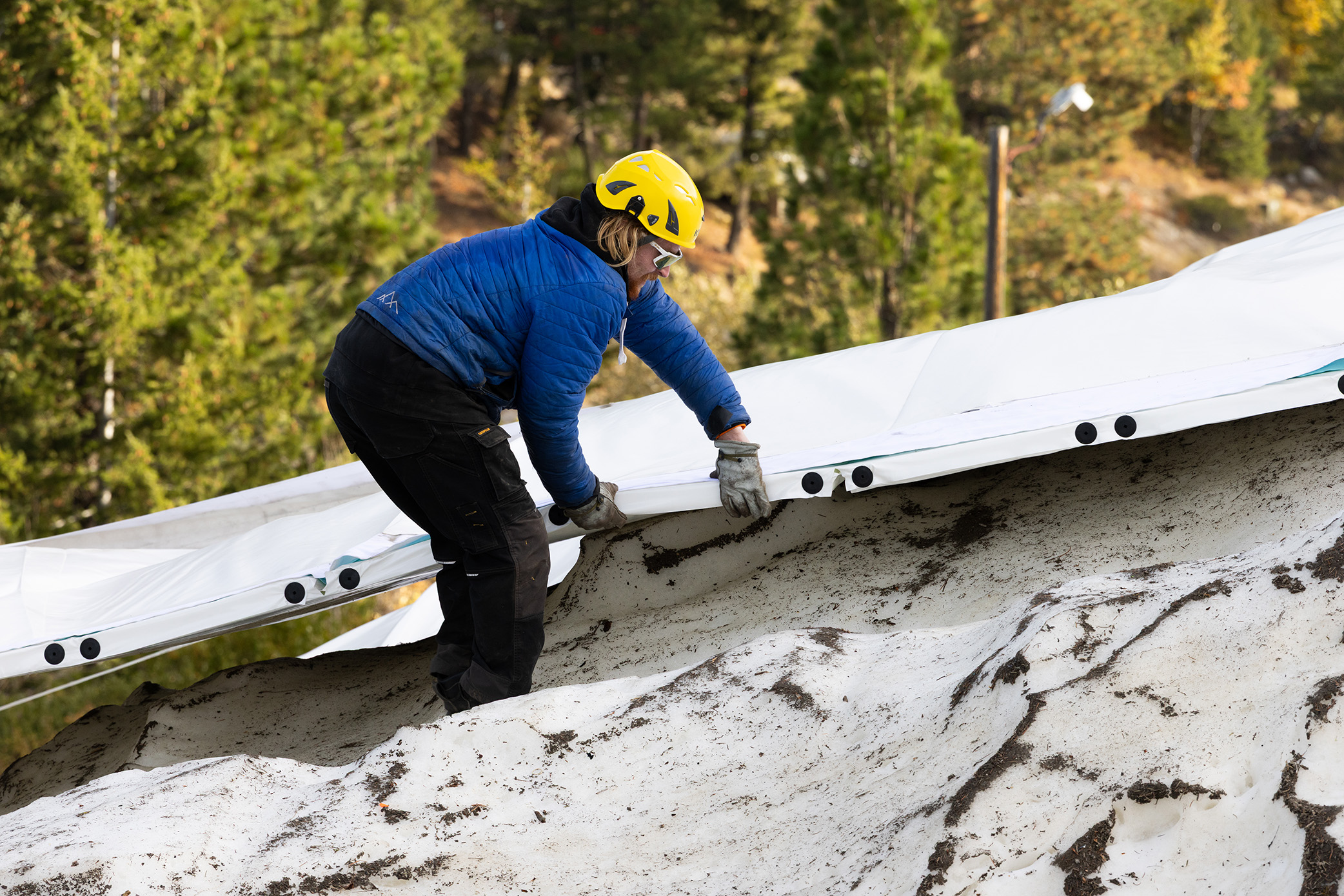 Later in February, as the team continued brainstorming how and where we would store snow for the following season, Director of Mountain Operations Nate Shake came across several Instagram posts featuring Snow Secure on slopes in Finland. Based on their website, Snow Secure appeared to be an all-in-one snow storage solution with over 20 years of development in Finland. The system promised 70% or more retention of your original snow pile at any elevation, on any aspect, and at any temperature—A bold claim.