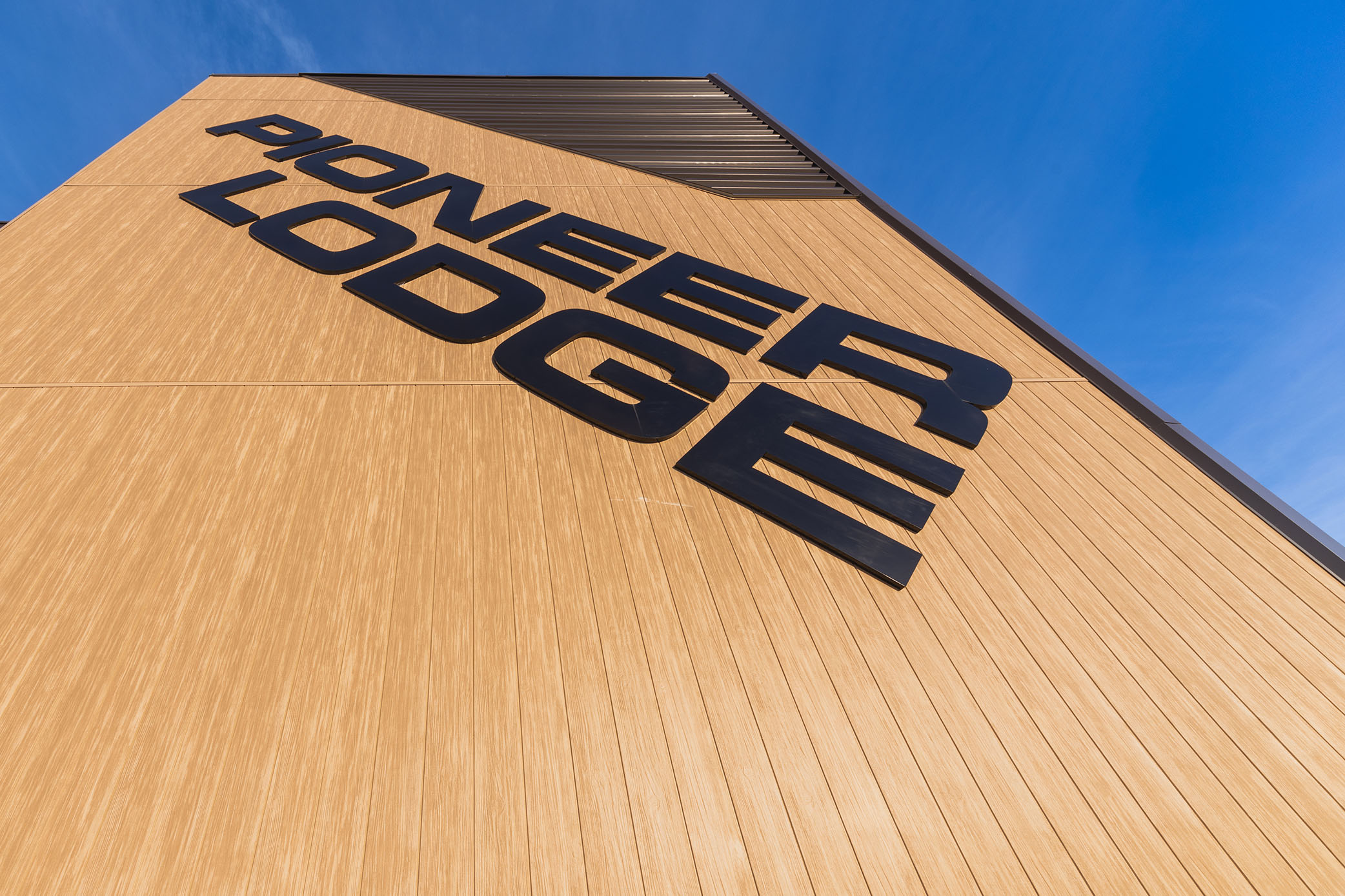 Caleb’s favorite part of the Pioneer Lodge remodel is the updated lettering on the front side of the lodge, that offers a nod to the past.