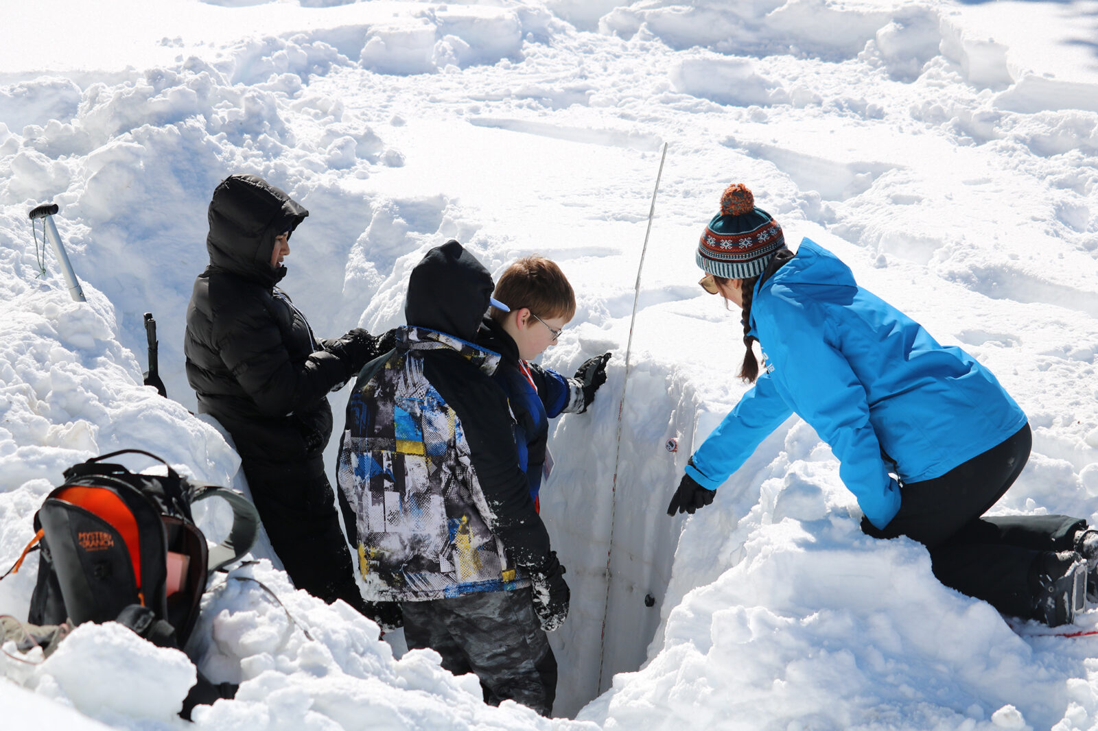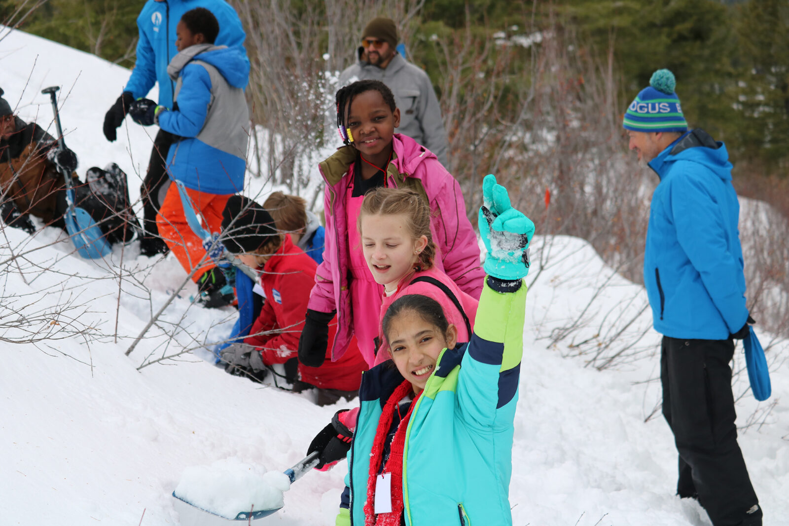 Each SnowSchool day begins with a simple moment: a school bus arriving in a snowy parking lot, students stepping out bundled in winter gear, many experiencing a full day in the snow for the very first time. From there, the mountain becomes their classroom. Guided by expert instructors and dedicated volunteer leaders, students strap on snowshoes and explore the winter landscape — digging snow pits, examining snow crystals, tracing how water moves through the watershed, and discovering how plants and animals survive and adapt in cold conditions.