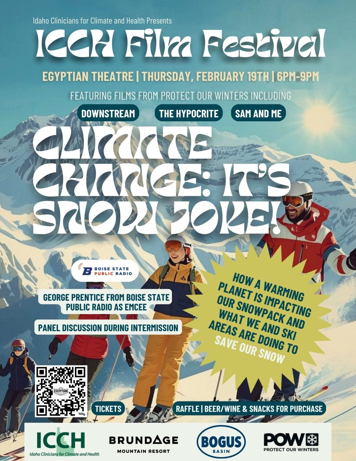Head to the Egyptian Theater for Climate Change is SNOW JOKE, where Idaho Clinicians for Climate and Health are presenting 3 films and an expert panel discussion moderated by Boise State Public Radio’s George Prentice. Films produced by Protect Our Winters address climate change’s impacts on our snowpack and our ability to recreate in winter, as well as on our mental and physical health. Humans are creating the problem, but we’re learning to be a part of the solution. Come learn how climate scientists, youth activists, and ski resorts are approaching this climate crisis and learn how to Save our Snow!