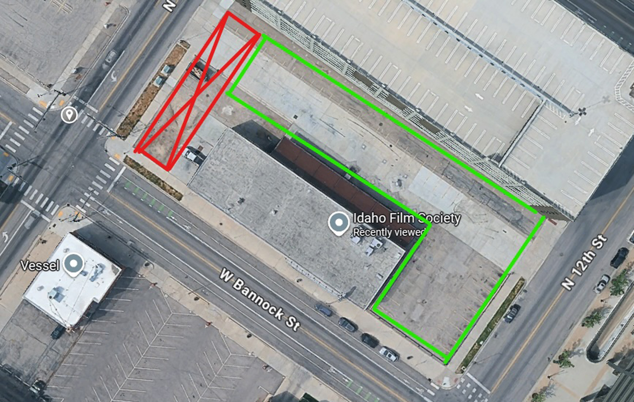 Please park within the areas outlined in green on the image below. Vehicles parked on the West Side of the building, highlighted in red (along the 13th street side of the lot) will be towed.